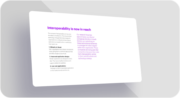 Interoperability is now in reach The concept of interoperability isn’t new, but Our research finds that the ability to manifest it is. This is due to three approximately one-third of technology changes that make it easier for companies (30.5%) in Growth organizations to configure and reconfigure Markets are capitalizing on applications as needed without overhauling these technological advances their digital core: to untangle the value trapped 1. Ubiquity of cloud: within their organization. These Many organizations have already moved to the companies are racing past their cloud, giving them a common data layer that competitors because they make provides a single source of truth. high interoperability central 2.Improved application design: to their overall business and Modern applications are designed to share technology strategy. data. They have simplified interfaces and support additional capabilities. 3. Low-cost applications: The large number of specialized applications on the market has reduced the cost.