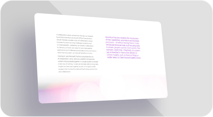 A collaborative culture comes from the top: our research Accenture has also enabled the introduction found that more than one fourth (27%) of executives in of new capabilities, automation and business Growth Markets consider a lack of collaboration across processes – all without leaving Teams. It also business functions as a top challenge caused by low/ introduced extra services, such as using bots no interoperability. Leadership can amplify collaboration to answer people’s queries more quickly. One by drawing up broad use cases for new interoperable example, CALM (CAL + Machine), is a custom applications and challenging employees across functions to app embedded in Teams that delivers in- solve them as a team—an internal hackathon of sorts. context insights, such as financial filings or Accenture8 uses Microsoft Teams to accelerate the art Twitter news, to Client Account Leads (CALs). of collaboration. Using Teams as-a-platform brings tools, content and processes together in a single location to enable a new way of working. Accenture has been able to bring data, insights and services together as part of its digital worker program that involves foundational technology, productivity and collaboration.