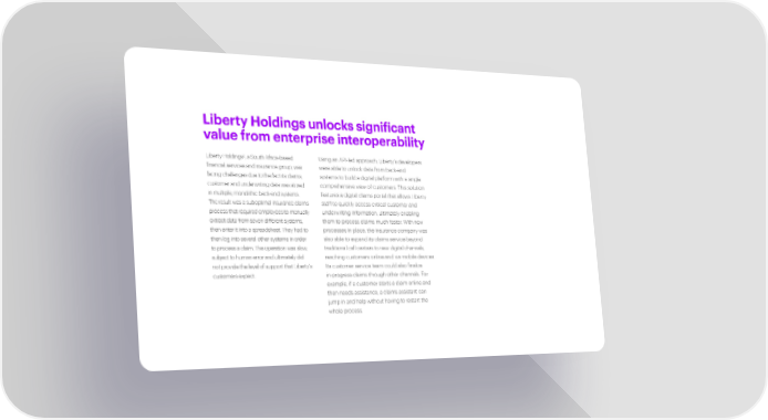Liberty Holdings unlocks significant value from enterprise interoperability Liberty Holdings2, a South Africa-based Using an API-led approach, Liberty’s developers financial services and insurance group, was were able to unlock data from back-end facing challenges due to the fact its claims, systems to build a digital platform with a single customer and underwriting data was stored comprehensive view of customers. This solution in multiple, monolithic back-end systems. features a digital claims portal that allows Liberty The result was a suboptimal insurance claims staff to quickly access critical customer and process that required employees to manually underwriting information, ultimately enabling extract data from seven different systems, them to process claims much faster. With new then enter it into a spreadsheet. They had to processes in place, the insurance company was then log into several other systems in order also able to expand its claims service beyond to process a claim. The operation was slow, traditional call centers to new digital channels, subject to human error and ultimately did reaching customers online and via mobile devices. not provide the level of support that Liberty’s Its customer service team could also finalize customers expect. in-progress claims through other channels. For example, if a customer starts a claim online and then needs assistance, a claims assistant can jump in and help without having to restart the whole process.