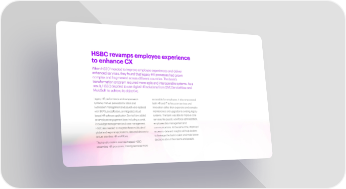 HSBC revamps employee experience to enhance CX 3 When HSBC needed to improve employee experiences and deliver enhanced services, they found that legacy HR processes had grown complex and fragmented across different countries. The bank’s transformation program required more agile and interoperable systems. As a result, HSBC decided to use digital HR solutions from SAP, ServiceNow and MuleSoft to achieve its objective. Legacy HR performance and compensation accessible for employees. It also empowered systems, manual processes for talent and both HR and IT to focus on services and succession management and payroll were replaced innovation rather than expensive and complex with SAP SuccessFactors, an integrated, cloud- maintenance and upgrades to existing legacy based HR software application. ServiceNow added systems. The bank was able to improve core an employee engagement layer, including a portal, services like payroll, workforce administration, knowledge management and case management. employee data management and HSBC also needed to integrate these multitude of communications. At the same time, improved global and regional applications, data and devices to access to data and insights will help leaders ensure seamless HR workflows. to leverage the bank’s talent and make better The transformation exercise helped HSBC decisions about their teams and people. streamline HR processes, making services more