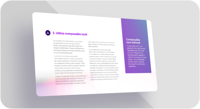 2.Utilize composable tech Composable Composable tech builds flexibility into the heart entire organization so everyone is on the same tech defined of organizations so they can cope with the page, creating a common purpose and driving Composable tech is an effects of disruption through faster, better and better decisions. approach that uses proven, cheaper transformation. It requires shifting from a As multi-application and multi-provider repeatable solutions that technology architecture of static, standalone parts deployments are prevalent in Growth Markets, can be configured and to one of composable pieces. composable tech can help enterprises easily reconfigured at speed to In practice, this involves using prebuilt, integrate a large number of applications, people, address changing business interoperable solutions to swap and plug-and- processes and data to create a seamless digital needs. This compresses play smaller application components, creating experience for their customers, as well as their transformation, setting new applications without wider disruption. These employees. In fact, composable tech is the natural the stage for rapid value solutions are often curated for specific industries next step from component-based architecture realization. and functions and act as a form of future prevalent in the region. Due to vast diversity across proofing—giving organizations the dexterity to the region, enterprises in Growth Markets regularly quickly adopt the technologies of tomorrow. design architectures in such a manner that the However, the greatest benefit of composable tech core system of record is common across multiple may be seamless data analysis and sharing. With countries while last mile systems such as logistics, data flowing between connected applications, payroll and payments are local to each country. companies can easily share information with the