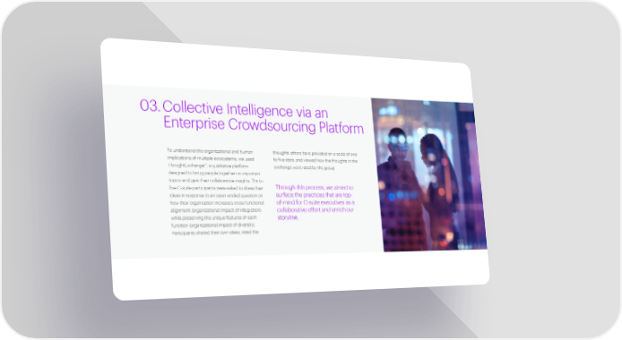 03. Collective Intelligence via an Enterprise Crowdsourcing Platform To understand the organizational and human thoughts others have provided on a scale of one implications of multiple ecosystems, we used to five stars, and viewed how the thoughts in the 10 ThoughtExchange , a qualitative platform exchange were rated by the group. designed to bring people together on important topics and gain their collaborative insights. Thirty- five C-suite participants were asked to share their Through this process, we aimed to ideas in response to an open-ended question on surface the practices that are top- how their organization increases cross-functional of-mind for C-suite executives as a alignment (organizational impact of integration) collaborative effort and enrich our while preserving the unique features of each storyline. function (organizational impact of diversity). Participants shared their own ideas, rated the