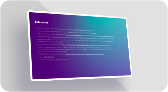References 1 World Bank, The Global Findex Database 2021, June 2022 (https://www.worldbank.org/en/publication/globalfindex) 2 Liberty saves millions of dollars using API-led connectivity: https://www.mulesoft.com/case-studies/api/liberty-holdings 3 HSBC revamps HR services and employee experience https://www.accenture.com/us-en/case-studies/financial-services/hsbc-hr-services-employee-experience 4 Marketing Technology Landscape 2022: https://chiefmartec.com/2022/05/marketing-technology-landscape-2022-search-9932-solutions-on-martechmap-com 5 Digital Innovation Requires Enterprise Application Vendors to Focus on What Matters: https://blogs.idc.com/2021/01/08/digital-innovation-requires-enterprise- application-vendors-to-focus-on-what-matters/ 6 Mining a competitive edge on Oracle Cloud https://www.accenture.com/in-en/case-studies/natural-resources/mining-competitive-edge-oracle-cloud 7 Based on average wages per hour data from US Bureau of Labor Statistics (https://www.bls.gov/news.release/empsit.t19.htm). Calculation: Productivity gain with interoperability x Average hours worked per day per employee (8 hrs) x No. of employees (10,000) x No. of working days in a year (260) x Average wages per hour ($32 as of June 2022 per US Bureau of Labor Statistics) 8 Transforming the employee experience with Teams https://www.accenture.com/us-en/case-studies/about/migrating-microsoft-teams 9 ATLAS.ti: https://atlasti.com/ 10 ThoughtExchange: https://thoughtexchange.com/about/