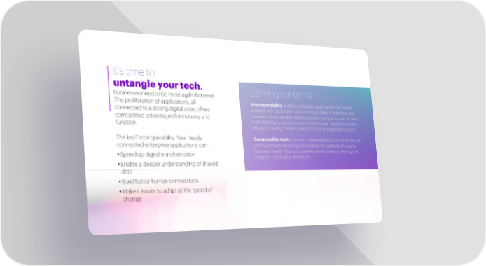It’s time to untangle your tech. Defining our terms: Businesses need to be more agile than ever. The proliferation of applications, all Interoperability is when enterprise applications can easily connected to a strong digital core, offers interact with each other and exchange data. A seamless user competitive advantages for industry and experience across applications creates a single source of data function. truth that aligns everyone to common goals, leading to better decision making, human connections and insight generation. The key? Interoperability. Seamlessly Composable tech is proven, repeatable solutions that can be connected enterprise applications can: configured and reconfigured at speed to address changing • Speed up digital transformation business needs. This compresses transformation, setting the stage for rapid value realization. • Enable a deeper understanding of shared data • Build better human connections • Make it easier to adapt at the speed of change