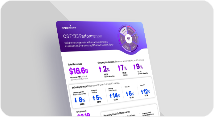 Q FY23 Performance Solid revenue growth with continued margin expansion and very strong EPS and free cash flow* Total Revenues Geographic Markets (Revenues and Growth in Local Currency) $1 . B % % % Increase of % in local $ B $ . B $ . B currency and % in USD North America Europe Growth Markets Industry Groups (Revenues and Growth in Local Currency) Communications, Financial Health & Products Resources Media & Technology Services Public Service % % % % % $ . B $ . B $ . B $ . B $ . B EPS (Adjusted) $ . Returning Cash To Shareholders % increase* Free Cash Flow Share Repurchases *After adjusting Q3 FY23 GAAP EPS of $3.15 Quarterly cash to exclude the impact of business dividend declared optimization costs of $0.42 per share and an investment gain of $0.38 per share. On a $ . B $ GAAP basis, Q3 FY23 EPS increased 13%. $1.12 Operating Margin (Adjusted) Dividends Paid Per Share . % Increase of $0.15 per share or 15%o ver the 0 bps increase* $ M quarterly dividend rate *After adjusting Q3 FY23 GAAP operating in fiscal year 2022 margin of 14.2% to exclude business optimization costs of 210 bps. On a GAAP basis, Q3 FY23 operating margin decreased 190 bps. Services Highlights of Strategic Priorities New Bookings Revenue Growth in Local Currency Revenue Growth in Local Currency (Includes overlap) Strategy & single-digit Cloud Song $ . B Consulting decline very strong double- strong double-digit digit growth growth Book-to-bill Technology -digit % increase in local currency growth Industry X Security strong double-digit very strong double- % increase in USD Operations double-digit growth digit growth growth To learn more about how we create value for all the stakeholders we serve, please visit the Accenture 360° Value Reporting Experience (www.accenture.com/reportingexperience). Accenture discloses information about its Services and Strategic Priorities to provide additional insights into the company’s business. Revenues for Services and Strategic Priorities are approximate and may be modified to reflect periodic changes in definitions. Judgment is required to allocate revenues for client arrangements with multiple offerings in to individual Services. Revenues for Strategic Priorities overlap so revenues for the same client arrangement may be included in multiple Strategic Priorities. For full financial data, non-GAAP financial disclosure and cautionary language regarding forward-looking statements, please refer to Accenture’s fiscal year 2023 third quarter news release on June 22, 2023, which accompanies this presentaton and is available at investor.accenture.com.
