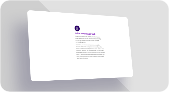 Utilize composable tech Composable tech builds flexibility into the heart of organizations and requires shifting from a technology architecture of static, standalone parts to one of composable pieces. In practice, this involves using proven, repeatable solutions that can be configured and reconfigured at speed to address changing business needs without wider disruption. However, the greatest benefit of composable tech may be seamless data analysis and sharing. With data flowing between connected applications, companies can easily share information, create a common purpose and drive better decisions.