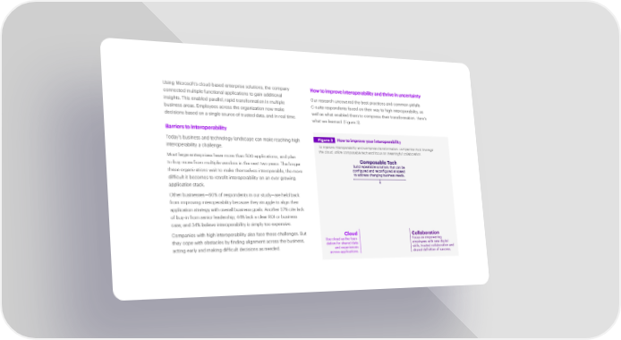 Using Microsoft’s cloud-based enterprise solutions, the company How to improve interoperability and thrive in uncertainty connected multiple functional applications to gain additional Our research uncovered the best practices and common pitfalls insights. This enabled parallel, rapid transformation in multiple C-suite respondents faced on their way to high interoperability, as business areas. Employees across the organization now make well as what enabled them to compress their transformation. Here’s decisions based on a single source of trusted data, and in real time. what we learned. (Figure 3). Barriers to Interoperability Today’s business and technology landscape can make reaching high Figure 3 How to improve your interoperability interoperability a challenge. To improve interoperability and compress transformation, companies must leverage the cloud, utilize composable tech and focus on meaningful collaboration. Most large enterprises have more than 500 applications, and plan Composable Tech to buy more from multiple vendors in the next two years. The longer Build repeatable solutions that can be these organizations wait to make themselves interoperable, the more configured and reconfigured at speed difficult it becomes to retrofit interoperability on an ever-growing to address changing business needs. application stack. Other businesses—60% of respondents in our study—are held back from improving interoperability because they struggle to align their application strategy with overall business goals. Another 57% cite lack of buy-in from senior leadership; 44% lack a clear ROI or business case; and 34% believe interoperability is simply too expensive. Companies with high interoperability also face these challenges. But Cloud Collaboration they cope with obstacles by finding alignment across the business, Use cloud as the foun- Focus on empowering dation for shared data employees with new digital acting early and making difficult decisions as needed. and experiences skills, trusted collaboration and across applications. shared definition of success.