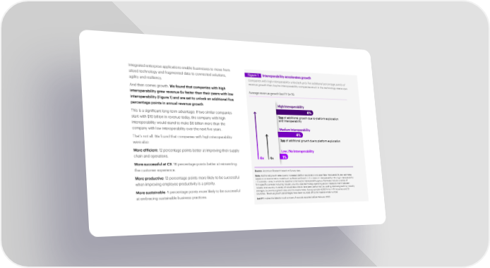 Integrated enterprise applications enable businesses to move from siloed technology and fragmented data to connected solutions, Figure 1 Interoperability accelerates growth agility and resiliency. Companies with high interoperability unlocked up to five additional percentage points of revenue growth than low/no interoperability companies stuck in the technology status quo. And then comes growth. We found that companies with high interoperability grew revenue 6x faster than their peers with low Average revenue growth last FY (in %) interoperability (Figure 1) and are set to unlock an additional five percentage points in annual revenue growth. High Interoperability This is a significant long-term advantage: If two similar companies 6% start with $10 billion in revenue today, the company with high 5pp of additional growth due to platform exploration and interoperability interoperability would stand to make $8 billion more than the company with low interoperability over the next five years. Medium Interoperability That’s not all. We found that companies with high interoperability 4% were also: 3pp of additional growth due to platform exploration More efficient: 12 percentage points better at improving their supply Low / No Interoperability chain and operations. 6x 4x 1% More successful at CX: 16 percentage points better at reinventing the customer experience. Source: Accenture Research based on Survey data. More productive: 12 percentage points more likely to be successful Note: Additional growth rates due to increased platform exploration and seamless interoperability are estimates based on an econometric model such as Revenue Growth i= A x medium interoperability + B x high interoperability when improving employee productivity is a priority. +C controls + error, in which the baseline is the low/no interoperability group. Estimates include a variety of firm-specific controls including industry, country, size, technology spending and an interaction term between industry and country. A variety of robustness checks have been performed (i.e., scaling revenue growth by industry More sustainable: 4 percentage points more likely to be successful averages, by previous growth rates and the results holds. Survey sample= 4,053 firms in 19 industries and 23 at embracing sustainable business practices. countries. Revenue growth percentages have been rounded off to the nearest whole number. Last FY implies the latest annual company financials reported before February 2022.