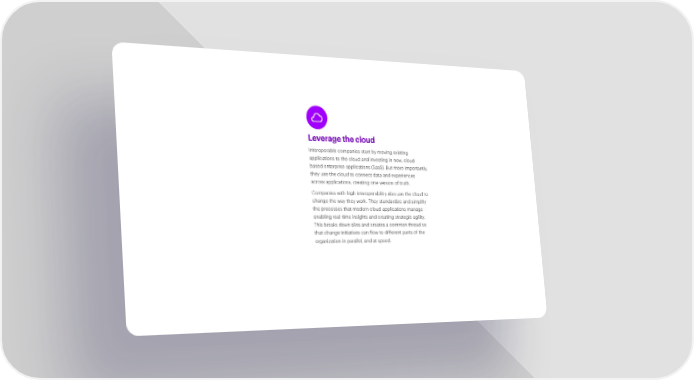 Leverage the cloud Interoperable companies start by moving existing applications to the cloud and investing in new, cloud- based enterprise applications (SaaS). But more importantly, they use the cloud to connect data and experiences across applications, creating one version of truth. Companies with high interoperability also use the cloud to change the way they work. They standardize and simplify the processes that modern cloud applications manage— enabling real-time insights and creating strategic agility. This breaks down silos and creates a common thread so that change initiatives can flow to different parts of the organization in parallel, and at speed.