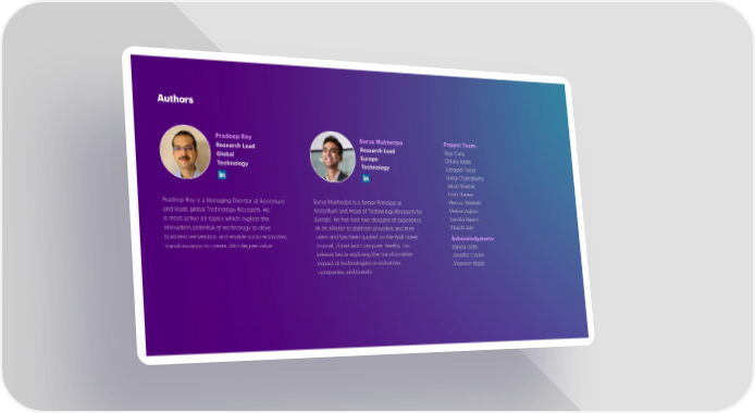 Authors Pradeep Roy Surya Mukherjee Project Team: Research Lead Research Lead Ajay Garg Global Europe Chiara Addis Technology Technology Ezequiel Tacsir Gargi Chakrabarty Jakub Wiatrak Krish Jhaveri Pradeep Roy is a Managing Director at Accenture Surya Mukherjee is a Senior Principal at Mariusz Bidelski and leads global Technology Research. He Accenture and Head of Technology Research for Mélina Viglino is most active on topics which explore the Europe. He has over two decades of experience Sandra Najem innovation potential of technology to drive as an advisor to platform providers and their Shachi Jain business reinvention and enable socio-economic users and has been quoted on the Wall Street Acknowledgments: transformation to create 360-degree value. Journal, ZDnet and Computer Weekly. His Salena Gallo interest lies in exploring the transformative Jennifer Cronin impact of technologies on industries, Shannon Mapp companies, and brands.