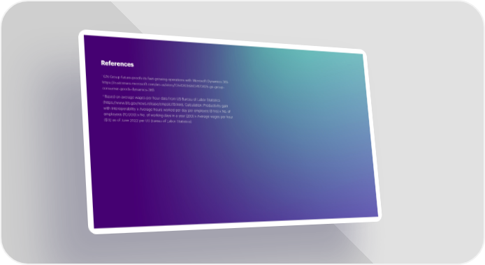 References 1 GN Group future-proofs its fast-growing operations with Microsoft Dynamics 365: https://customers.microsoft.com/en-us/story/1354283595134173825-gn-group- consumer-goods-dynamics-365 2 Based on average wages per hour data from US Bureau of Labor Statistics (https://www.bls.gov/news.release/empsit.t19.htm). Calculation: Productivity gain with interoperability x Average hours worked per day per employee (8 hrs) x No. of employees (10,000) x No. of working days in a year (260) x Average wages per hour ($32 as of June 2022 per US Bureau of Labor Statistics)